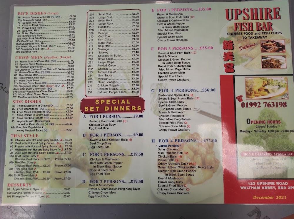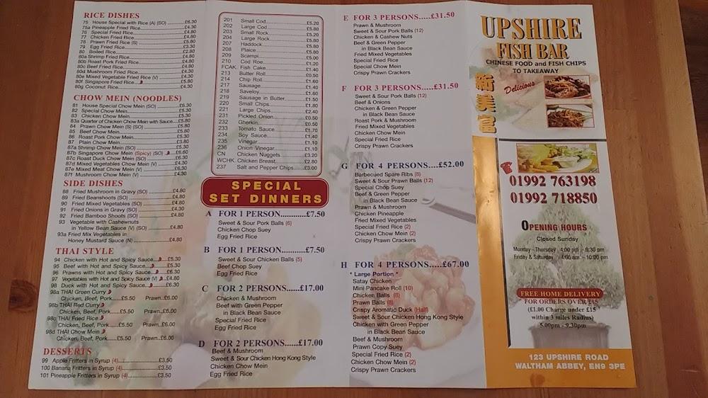 Nestled in the heart of Waltham Abbey, Upshire Fish Bar beckons locals and visitors alike. At 123 Upshire Rd, it enjoys a convenient position within a friendly neighborhood known for its rich history and charming atmosphere. Nearby, you'll find a mix of residential areas and green spaces, adding to the inviting vibe of the locality. The restaurant boasts casual seating that welcomes families and friends, making it a perfect place to gather for a delicious meal.